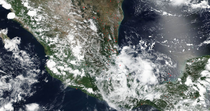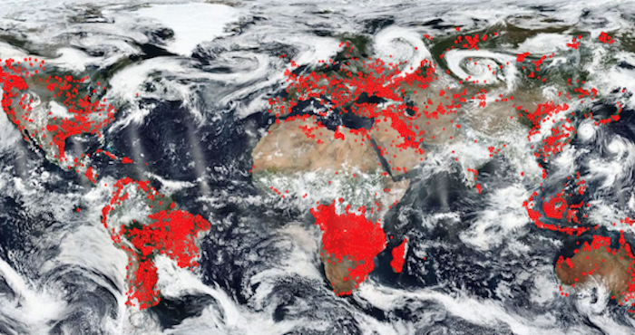 En esta foto, los puntos rojos designan puntos en el planeta donde las bandas térmicas de la NASA han detectado incendios activos.