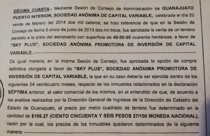 “Mediante sesión del Consejo de Administración de Guanajuato Puerto Interior, Sociedad Anónima de Capital Variable, celebrada el día 20 de febrero de 2014, se hizo referencia de que en la sesión del Consejo de fecha 5 de junio de 2013, fue aprobada la venta de un terreno paralelo a la pista del aeropuerto, con una superficie de 40-00-00 hectáreas a favor de Sky Plus, Sociedad Anónima Promotora de Inversión de Capital Variable”, se estipula en la declaración décima cuarta del documento.