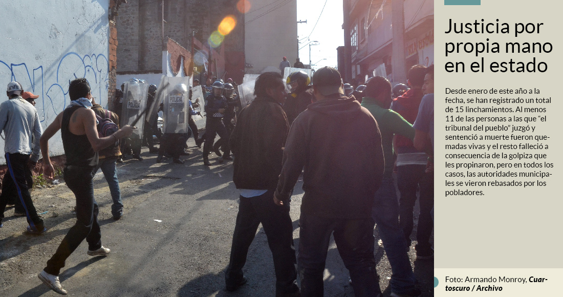 Desde enero de este año a la fecha, se han registrado un total de 15 linchamientos. Al menos 11 de las personas a las que “el tribunal del pueblo” juzgó y sentenció a muerte fueron quemadas vivas y el resto falleció a consecuencia de la golpiza que les propinaron. En todos los casos, las autoridades municipales se vieron rebasados por los pobladores.