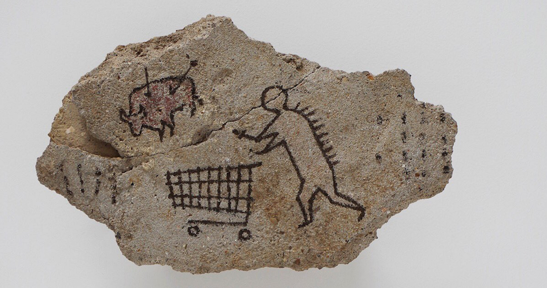 Durante tres días, la pieza, que recrea una pintura rupestre en la que un hombre empujando un carro de supermercado persigue a un animal parecido a un bisonte, estuvo expuesta y nadie se percató de que no formaba parte de la exposición original.