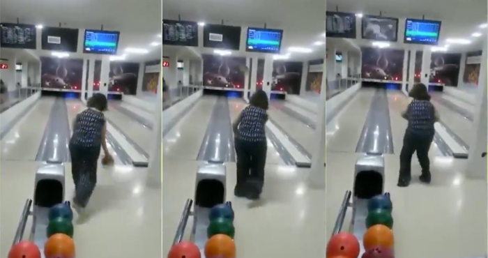 La inexperta jugadora lanzó la bola de boliche intentando atinarle a los pinos; sin embargo, su disparo salió desviado y dio justo en una pantalla de televisión que se encontraba arriba del carril de bolos.