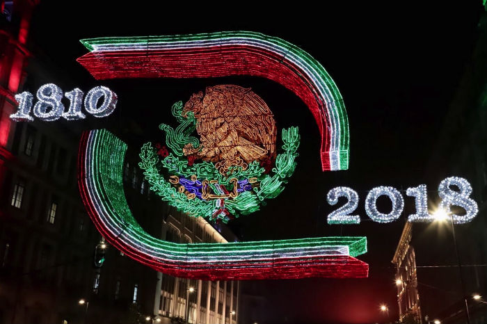 El Zócalo de Ciudad de México luce desde hoy el alumbrado decorativo de las Fiestas Patrias 2018, con motivo de la Independencia nacional. Los mosaicos serán iluminados durante todo este mes.