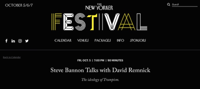 The New Yorker, un clásico del periodismo norteamericano, ha organizado uno de esos eventos. Uno de los platos fuertes es una entrevista de su director, David Remnick, a Steve Bannon, ex consejero de Trump en la Casa Blanca y la figura más conocida de la nueva ultraderecha norteamericana (el director de The Economist ya le entrevistó en un foro similar en marzo, y les gustó porque le anuncian otra vez para septiembre).