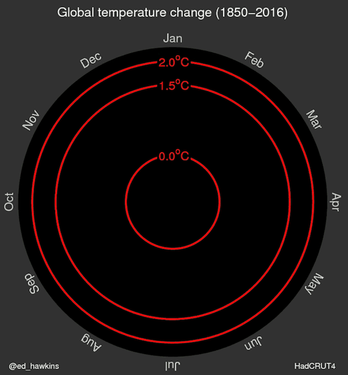 Por su parte, Ed Hawkins elaboró en forma de espiral la visualización acerca del calentamiento global más convincente jamás realizada.