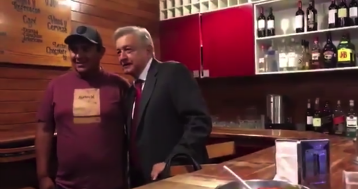 En el video difundido a través de las redes sociales, se observa cómo el tabasqueño posa para las instantáneas con cada uno de los presentes, quienes también se ríen cuando pide su torta de lomo para llevar.