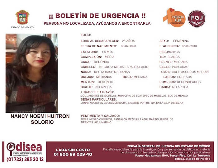 Ciudad de México, 12 de septiembre (SinEmbargo).– Nancy Noemí Huitron Solorio, de 28 años, desapareció con su pequeña hija Valentina, de dos meses de edad, luego de dejar a sus otras dos hijas en una primaria ubicada en la colonia Jardines de Morelos en Ecatepec, Estado de México. Hoy, suman seis días en los que no sabe nada de ambas.