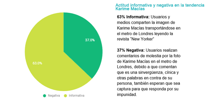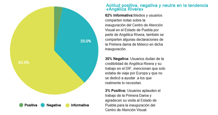 Ambas tendencias generaron múltiples menciones negativas para las dos mujeres, aunque la percepción se neutralizó por la participación de medios de comunicación y cuentas gubernamentales y algunos simpatizantes en el caso de Rivera. Los usuarios que opinaron contribuyeron a que la persepción negativa alcanzara un 35 por ciento en el caso de la esposa de Enrique Peña Nieto y 37 por ciento, con respecto a Macías.