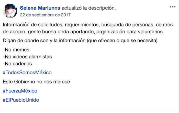 De acuerdo con López Sáenz, los grupos de Facebook permitieron la coordinación de esfuerzos y los llamados de ayuda; mientras que en Twitter, el uso de los hashtags movilizó con más rapidez la información. Fue en esta red donde iniciativas ciudadanas como #Verificado19S se enfocaron en combatir el déficit de información que surgió en torno a la ubicación y estado de las fincas afectadas por derrumbes y daños estructurales. Para esto se apoyaron con la creación de mapas, y entre otras actividades, también organizaron labores de logística en centros de acopio.