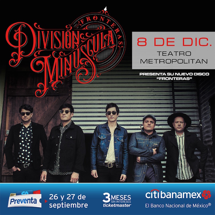 Ciudad de México, 20 de septiembre (SinEmbargo).- División Minúscula llegará de nueva cuenta a los escenarios de la Ciudad de México para presentar "Fronteras", su sexto disco, en el Teatro Metropólitan el sábado 8 de diciembre. La venta al público en general comenzará el 28 de septiembre en taquillas y a través de Ticketmaster.