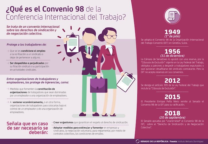 El Senado de la República ratificó el Convenio 98 de la Organización internacional del Trabajo con el que se puso fin a la imposición de pertenecer a un gremio para laborar en una empresa y los patrones ya no podrán utilizar a los llamados sindicatos blancos para llegar a acuerdos provechosos en donde sólo se beneficiaban los líderes y ellos.