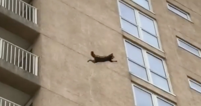El atrevido mamífero escaló aproximadamente nueve pisos de un edificio; de pronto se detiene y salta al vacío. Algunas personas que estaban de espectadores se sorprendieron al observar que el animalito sobrevivió al impacto y no sólo eso; sino que se fue corriendo del lugar.