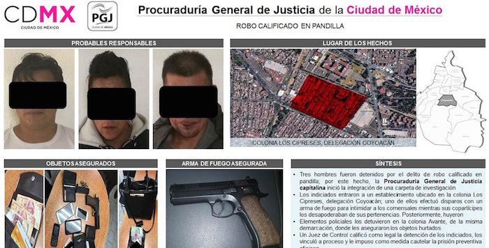 Posteriormente, los sujetos fueron detenidos en la colonia Avante de la misma delegación, junto con los objetos robados, y trasladados al Ministerio Público, donde se les dictó prisión preventiva.