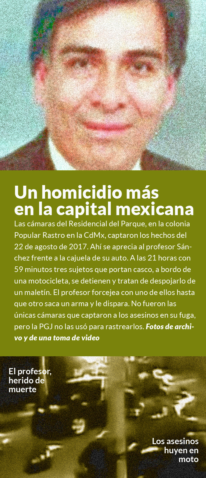 Las cámaras del Residencial del Parque, que se ubica en una calle dividida por un camellón, captaron los hechos del 22 de agosto de 2017. En el video se aprecia al profesor Sánchez frente a la cajuela de su vehículo, estacionado a un costado del camellón. A las 21 horas con 59 minutos tres sujetos que portan casco, a bordo de una motocicleta, se detienen junto al profesor Sánchez y tratan de despojarlo de un maletín. El profesor Sánchez forcejea con uno de ellos hasta que otro de los individuos saca un arma y le dispara en cuatro ocasiones. Los individuos lograr llevarse el maletín, que contenía dos laptops.