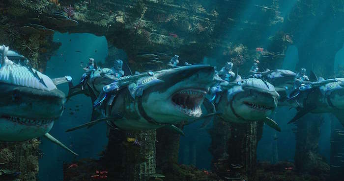 11. Aunque buena parte de la película transcurre bajo el agua, casi no filmaron en ese elemento. “Los humanos nos movemos lentos en el agua y todo parece cámara lenta. Pero esta gente que vive bajo el agua, los atlantes, se mueven muy rápido, es su medio. Así que no era práctico para mí rodar demasiado debajo del agua”, apunta Wan. Lo que hicieron fue rodar con un fondo azul sobre el que se añaden efectos digitales para lograr la apariencia de estar bajo el agua.