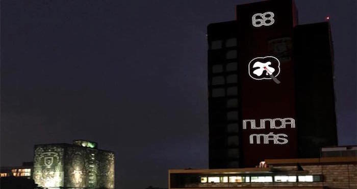 Esta noche la universidad apagó las luces del edificio de Rectoría, en Ciudad Universitaria, para proyectar en con letras y una figura luminosa color rojo que conmemoran la represión del 2 de octubre de 1968, en la Plaza de las Tres Culturas.