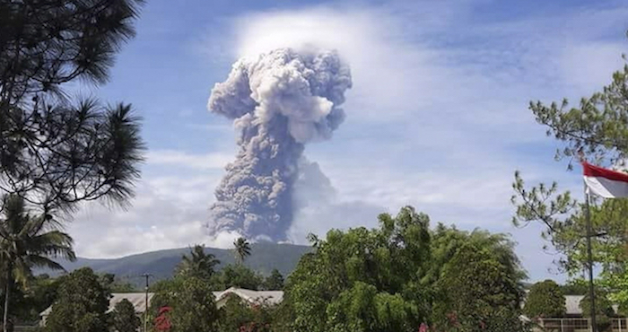 El volcán se encuentra a unos 600 kilómetros en la misma isla afectada el pasado viernes por un terremoto de magnitud 7.5 seguido de un tsunami que ha causado más de mil 200 muertos.