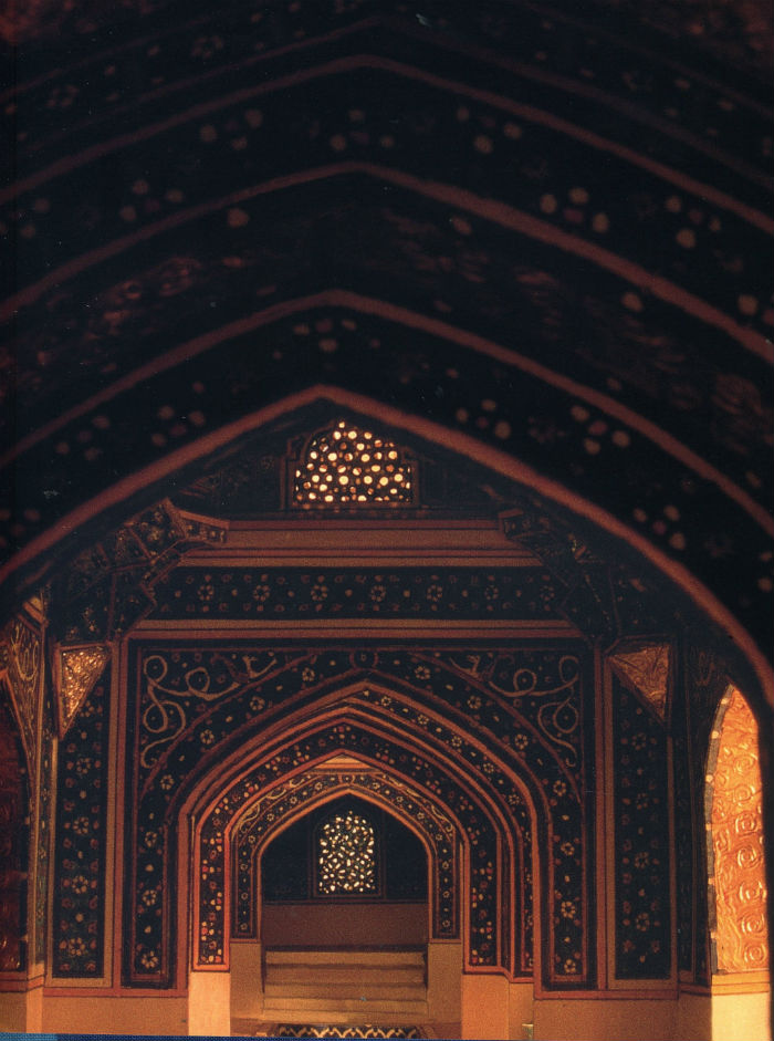 Al Azrak, el Palacio Azul parece sacado del más intenso sueño del oriente. El azul de sus cúpulas, que difuminan su presencia y lo hace uno con el cielo, nos recibe apenas nos adentramos al capítulo dedicado a la organización de sus salones y patios. El iwan de la puerta del talismán prepara al visitante para el goce estético que provendrá de los arabescos patios del palacio mientras que los iwanes del patio de honor hacen que la imaginación se prepare a abordar espacios múltiples, laberintos que son siempre la idea del occidental al pensar en los interiores que ofrecen las edificaciones orientales. Esta idea, nos explicará Zahar, es más bien falsa. Cada espacio de Al Azrak tiene funciones definidas en mayor o menor medida. Así, tenemos el Selamlik, el conjunto de espacios reservados a los hombres: patios, salones, etcétera; y el Haremlik —Casa de las esposas— que consistía en las habitaciones reservadas a la familia y a las mujeres, el salón del trono, el patio de honor, etcétera.