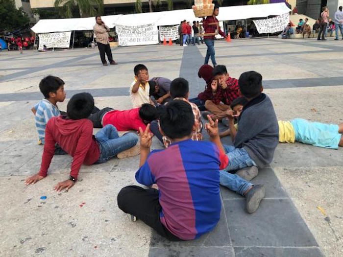 Las familias desplazadas, conformada por 38 personas entre ellas 14 niños, se unieron al plantón que mantienen afuera de palacio de gobierno. Foto: Sandra de los Santos, Chiapas Paralelo.