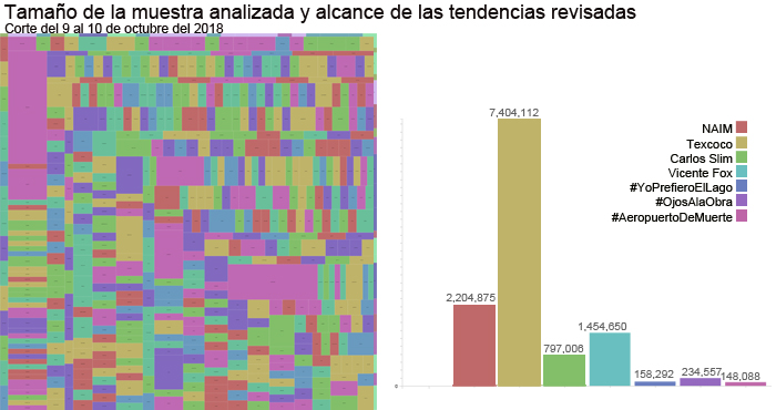 Según la agencia Metrics, esta discusión generó 19 mil tuits durante este miércoles, con una alcance de 11 millones 900 mil personas. Las conversaciones se dispersan a través de múltiples hashtags. #Naim, #Naicm, #LaConsultaVa, #NoAlNAICM #pueblosenresistencia, #AeropuertoDeMuerte y #YoPrefieroElLago, etiquetas que se han movilizado para emitir posicionamientos en contra o a favor del aeropuerto.