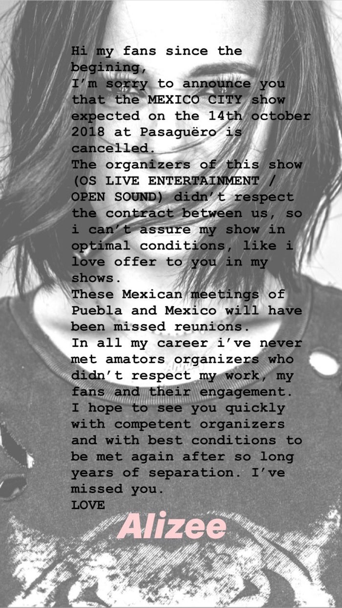 El concierto que se tenía contemplado para el próximo 14 de octubre en el Pasagüero, ubicado en el Centro Histórico de la Ciudad de México, así como las reuniones con sus fans en Puebla fueron canceladas. El anuncio fue compartido a través de la cuenta de Twitter de la cantante.