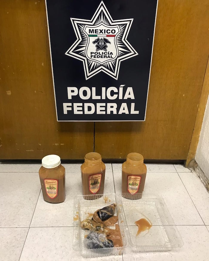 Los frascos venían de Guanajuato y serían enviados al estado de Texas, en Estados Unidos. En su interior contenían cajeta y bolsas de plástico que ocultaban la droga, informó en un comunicado la Policía Federal.