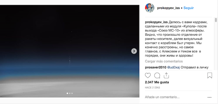Prokópiev, miembro de la 57.ª expedición de la EEI, publicó las fotografías este sábado en su cuenta de Instagram, donde señala que la avería ocurrió luego de que la nave espacial "Soyuz MS-10 saliera de la atmósfera".