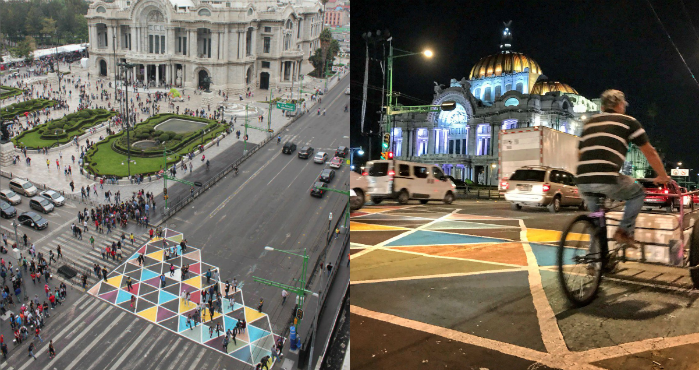 Camina detalló que la intervención consistió en la pinta artística de más de 30 triángulos de diferentes colores sobre el arroyo vehícular, así como en la implementación de un cruce en diagonal con un tiempo semafórico exclusivo para peatones, por lo que hay un momento en donde todos los automóviles de todas direcciones permanecen parados, mientras el peatón puede cruzar en diagonal, ahorrando tiempo y esfuerzo.