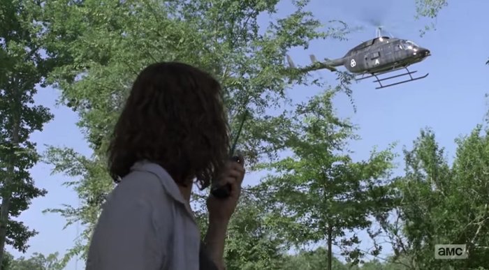 En su segunda aparición, el helicóptero pasa en el vertedero ante Jadis, que no pareció nada sorprendida de verlo. Es más, sus acciones indicaban que lo estaba esperando y parecía que incluso tenía controlada su frecuencia de vuelo porque en el momento en el que suena la alarma de su reloj, aparece el artaefacto, deja lo que estaba haciendo -y no era algo menor, ya que estaba ante un Negan maniatado y un caminante unido a una camilla- e intentó, sin éxito, llamar la atención de sus desconocidos tripulantes con una bengala.