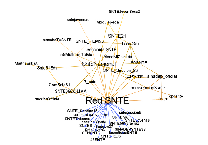 A su vez, los sindicatos nacionales también mantienen interés por promover una agenda digital. En las estructuras que crean sobresalen agrupaciones como el SNTE, y el Sindicato STPRM, que se caracterizan por la dispersión en secciones que en pocas ocasiones interactúan entre sí. Cada sección es un cluster separado. Sin embargo, en todas ellas, así como en las cuentas oficiales prevalece un discurso legitimador con el que se busca avalar la representatividad de los líderes desde la institucionalidad de los sindicatos. Este es un fenómeno complejo en el que convergen las fuerzas oficialistas que a toda costa buscan que los líderes en turno, Juan Díaz de la Torre y Carlos Romero Deschamps sean asumidos como tal por la mayoría de trabajadores y una fuerza emergente que constituyen las voces que en las redes sociales manifiestan abierto repudio a ambos personajes.