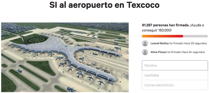 Dirigida a la Secretaría de Comunicaciones y Transportes (SCT) y al área de Atención ciudadana del Gobierno de México, la petición de que continúe la construcción en Texcoco es la que más apoyo ha recabado, superando hasta ahora las 44 mil firmas. "La Ciudad de México, una de las más grandes del mundo, requiere de un aeropuerto grande y moderno que pueda transportar a millones de pasajeros que vienen de todo el mundo a nuestro país y a otras partes. ¿Se imaginan llegar al actual aeropuerto y tener que transportarse a Toluca o Santa Lucía para hacer la conexión de tu vuelo a otro lado?", se lee en la petición.