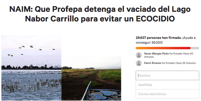 Los ciudadanos también piden firmas para exhortar a la Procuraduría Federal de Protección al Ambiente (Profepa) a que detenga la desecación del Lago Nabor Carrillo que están provocando las obras del nuevo aeropuerto, a que presente una alternativa sustentable para el NAIM y construya en su lugar "La nueva Tenochtitlan". Estas son las peticiones disponibles en Change.org: