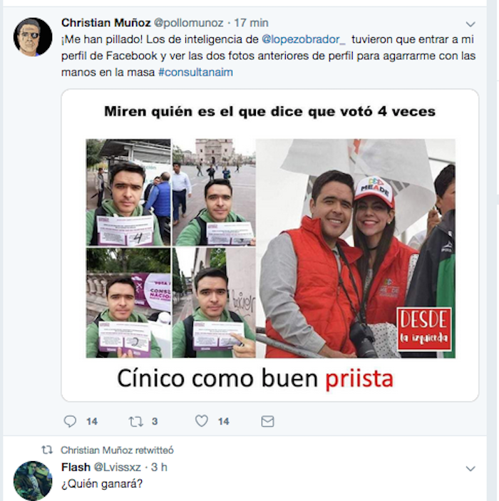 Durante las primeras horas, Christian Muñoz Robles, actual Secretario de Municipios de Oposición del PRI en Aguascalientes, tuvo éxito en ser identificado por los usuarios como un ciudadano apartidista. Sin embargo, por la tarde comenzaron a circular numerosas fotografías en las que aparece junto a priistas como Javier Lozano Alarcón. Las publicaciones del joven priista y los reportes periodísticos generaron numerosas reacciones en las redes sociales. Entre las reacciones trascendió la participación de voces opositoras a la Consulta, como el colectivo #ConsultaParaTodos, y críticos de López Obrador. No obstante, la actividad que derivó de los reportes no logró disipar la participación en la encuesta.