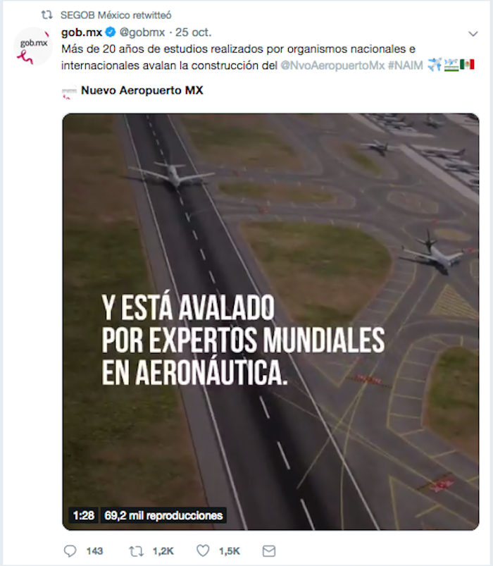 Mientras la polémica se avivó entre quienes están en contra y a favor de que se construya el Nuevo Aeropuerto Internacional de México en Texcoco, la cuenta de Twitter de la Secretaría de Comunicaciones, apoyada por cuentas con aspecto bot y cuentas oficiales del Gobierno federal, promovieron el megaproyecto.