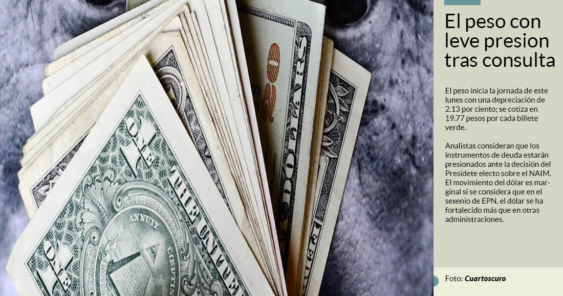 El peso mexicano abrió su primera sesión de esta semana con una depreciación de 2.13 por ciento o 41.2 centavos con respecto al cierre del viernes. Sin embargo, antes de que iniciara la jornada de este lunes, el desplome de la divisa ya era el principal argumento en contra de la Consulta Nacional sobre el NAIM. En esta movilización trascendió la participación de las mismas cuentas antagónicas que se han pronunciado en contra de López Obrador, su consulta y la propuesta del aeropuerto en Santa Lucía, entre las que destacan agrupaciones como #ReAcción_Ciudadana y el grupo #Libertad.