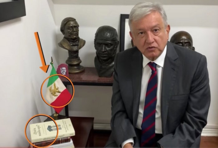 Usuarios en redes sociales destacaron la bandera y el libro que se observan junto a Andrés Manuel López Obrador en un video compartido hoy, señalaron que ambos simbolizan la ideología que comparte con el ex Presidente Benito Juárez.