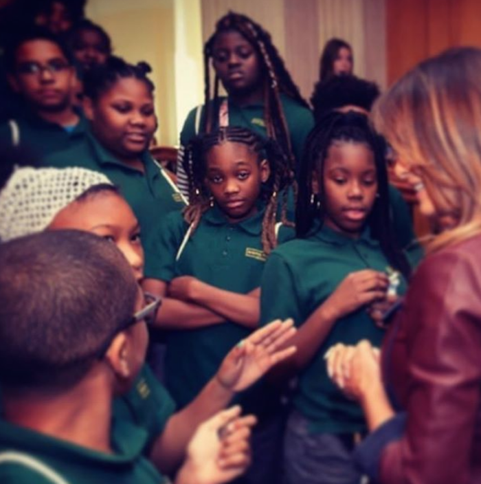 En la instantánea se aprecia cómo la niña, con los brazos cruzados, mira de forma desafiante a la cámara, mientras el resto de compañeros conversan con la primera dama estadounidense.