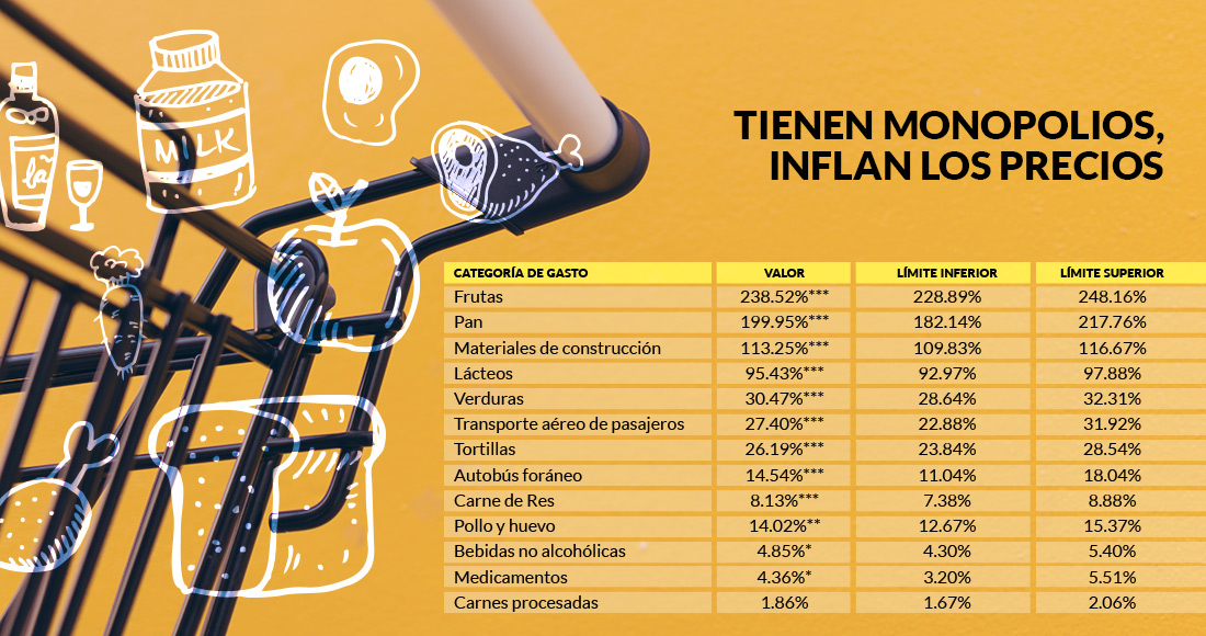La Cofece, por ejemplo, planteó a principios de octubre de este año que la falta de competencia y los monopolios de mercado hacen que los hogares mexicanos paguen un sobreprecio de hasta 98.23 por ciento al momento de consumir bienes de consumo final –tortilla de maíz, pan, cárnicos y huevo, lácteos, frutas, verduras, bebidas no alcohólicas, medicamentos y materiales de construcción– y servicios como el transporte foráneo de pasajeros.