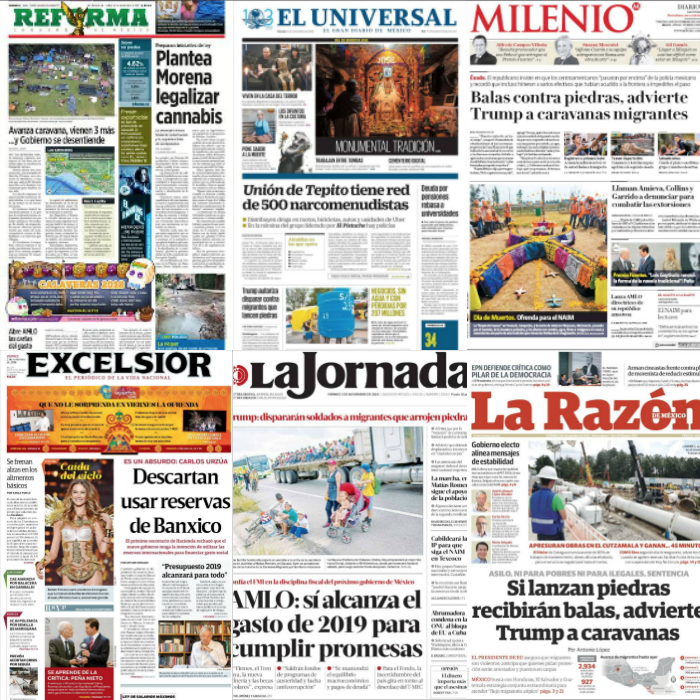 En La Razón: Si lanzan piedras recibirán balas, advierte Trump a caravanas. El Presidente de Estados Unidos, Donald Trump, se mostró confiado en que los soldados enviados a la frontera sur logren frenar las caravanas migrantes de miles de personas. “Los frenamos en la frontera, es una invasión”, denunció ayer.