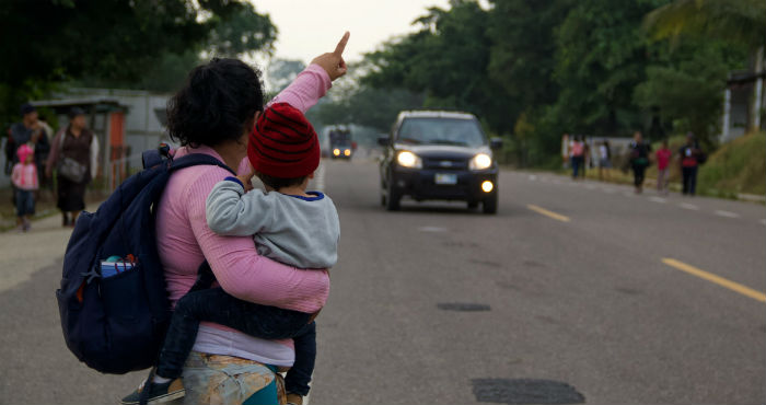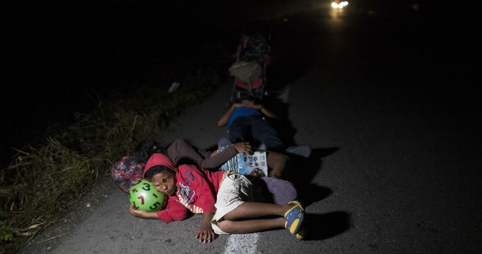 La familia llegó a Santa Rosa de Copan a las 03:00 de la madrugada y caminó siete horas con la caravana hasta la frontera entre Guatemala y México, y durmieron sobre el puente internacional.