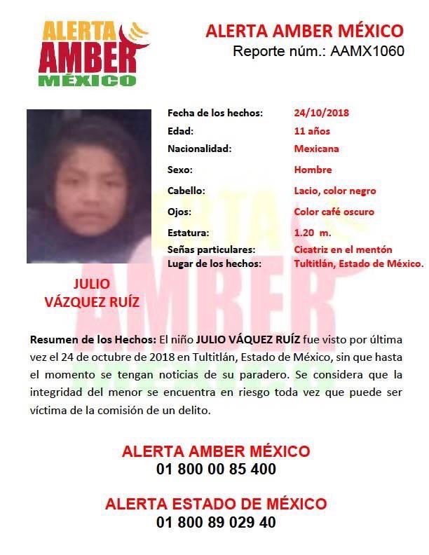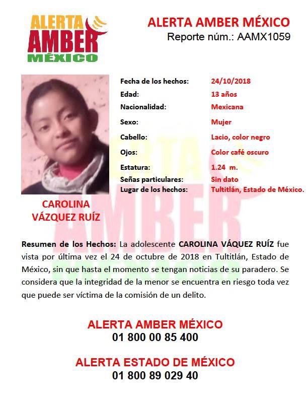 Carolina y Julio Vázquez Ruiz, de 13 y 11 años de edad, respectivamente, así como su primo Adelaido Vázquez Gómez, de 12 años, salieron de su domicilio en Rinconada San Marcos, en la zona sur de Tultitlán el pasado 24 de octubre, sin que se conozca su paradero.