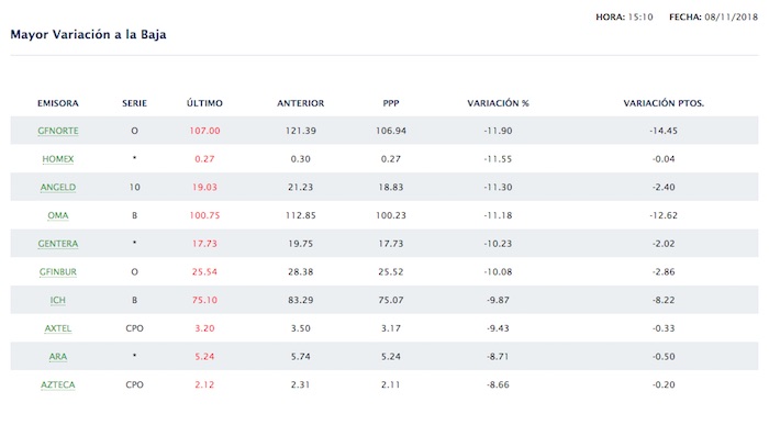 Las bajas fueron encabezadas por Grupo Financiero Banorte, con pérdidas de 11.90 por ciento, Gentera (10.23 por ciento), Grupo Financiero Actinver (11.30 por ciento), Grupo Financiero Inbursa (10.08 por ciento), Santander (8.12 por ciento) y Banco del Bajío (6.97 por ciento).