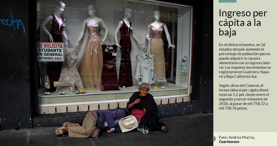 El informe también detalló que el poder adquisitivo del ingreso laboral se redujo 1.1 por ciento en el tercer trimestre de 2018, por lo que en 26 de las 32 entidades federativas aumentó el porcentaje de población que no pudo adquirir la canasta alimentaria con su ingreso laboral.
