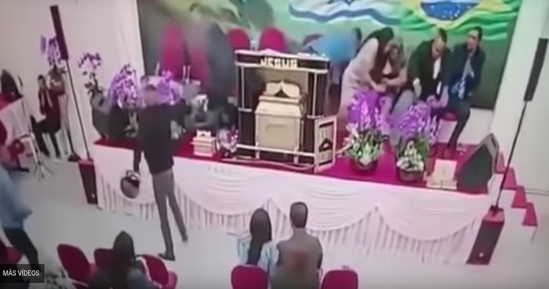 El video recoge el momento en el que Weslei Souza apunta su arma directamente al pastor, Adilio Carloto da Silva, que logró sobrevivir milagrosamente saltando detrás del altar con la palabra "Jesús" escrita en él.