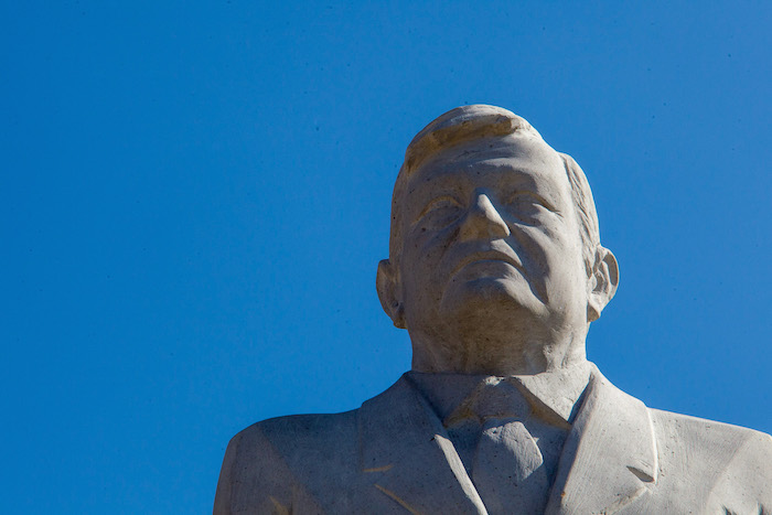 La estatua hecha de cantera fue colocada en el rancho Rutilandia en medio de otras de Emiliano Zapata y Francisco Villa, personajes destacados de la historia mexicana.
