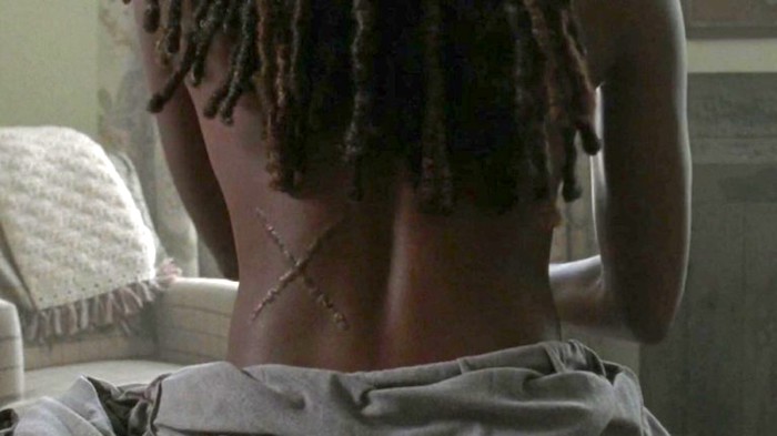 Daryl tiene dos cicatrices en forma de equis, junto con otros cortes. En el caso de Michonne, solo se muestra la parte inferior de su espalda,, por lo que no está claro si tiene más. La exactitud de la parte inferior de la espalda como la ubicación principal podría ser una pista sobre lo que sucedió y sobre las identidades de los otros personajes que las comparten.