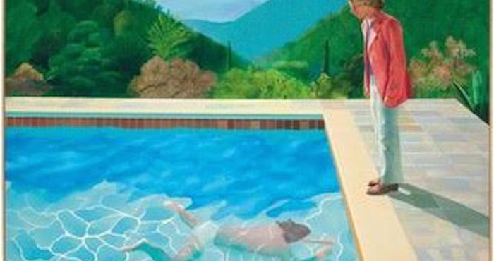 Pero volvamos a la obra más costosa producida por un artista vivo. Pocas veces podremos admirar una pintura que reúna tantas cualidades. Diáfana, sensual, con mínimos recursos figurativos, narra puntualmente una escena: Pool with two figures, como también se le conoce, es una estampa con múltiples significados. Un espacio rodeado de montañas lejanas, al centro una piscina; un chico de pie en la orilla vestido a la moda de los setenta, contempla a otro que nada bajo el agua aproximándose hacia él. Los colores son brillantes, la luz cenital, seguramente es mediodía; la tenue sombra corta el suelo. La humedad y transparencia sugieren algo más. La composición es plana pero su bidimencionalidad no le resta ningún atributo. ¿Qué vemos ahí? dos amigos, confidentes, quizá cómplices, o tal vez amantes, a punto de encontrarse, apartados del mundo, han “pintado” su propio paraíso, se encuentran en un acto de solipsismo previo al carnal. Alegoría a la libertad, defensa en contra de los prejuicios, esta imagen es hoy icónica para la historia del arte ya que representa la ambigüedad y logra perturbarnos, paradójicamente, por su claridad. ¿Quién vive un amor prohibido en plena luz del día?