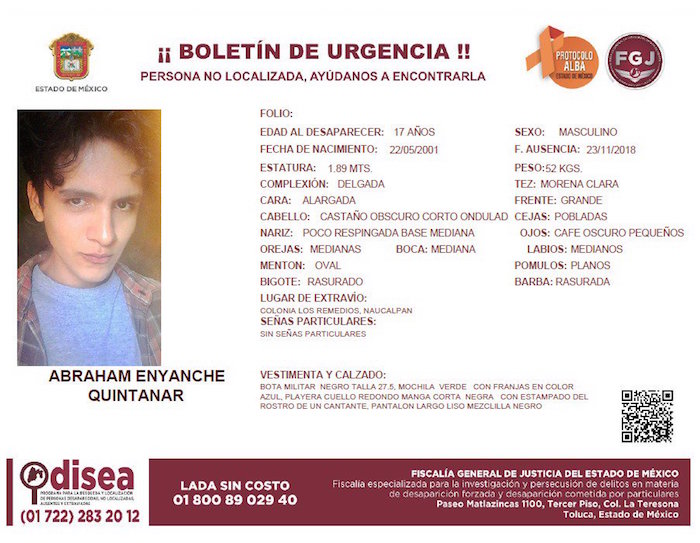 El día de su extravío, el 23 de noviembre, el joven vestía botas negras, portaba una mochila color verde con franjas azules, una playera de cuello redondo y manga corta negra con el estampado de un cantante y usaba un pantalón de mezclilla negro.