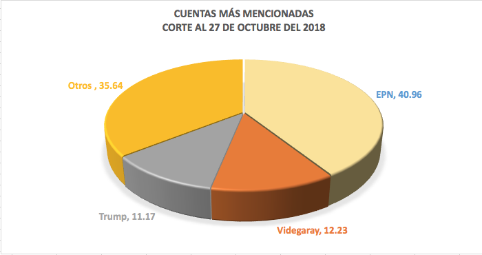 En la conversación hubo pocas menciones a Jared Kushner (@jaredkushner), quien posee una cuenta verificada en Twitter y creada en el 2009, que nunca ha usado. De acuerdo con el análisis realizado sólo obtuvo el 5.9 por ciento de menciones, en tanto que la mayoría se destinaron a Peña Nieto, quien obtuvo el 27 por ciento