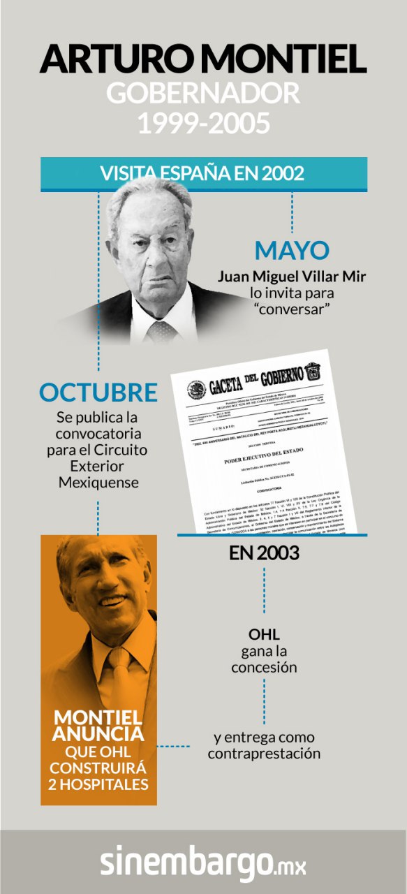 Ciudad de México, 29 de noviembre (SinEmbargo).- Dos visitas de Arturo Montiel Rojas a España en 2002, habrían bastado para sellar la licitación del Circuito Exterior Mexiquense (CEM). La primera ocurrió en mayo, cuando por invitación expresa de Juan Miguel Villar Mir, dueño de OHL, viajó para platicar de una “estrategia comercial internacional”. La segunda fue en octubre, y en diciembre el ex Gobernador anunció que esa empresa construiría dos hospitales en el Estado de México para “ampliar la infraestructura”; sin embargo, esas obras se entregarían como la “contraprestación” de la obra que OHL ganaría dos meses después.