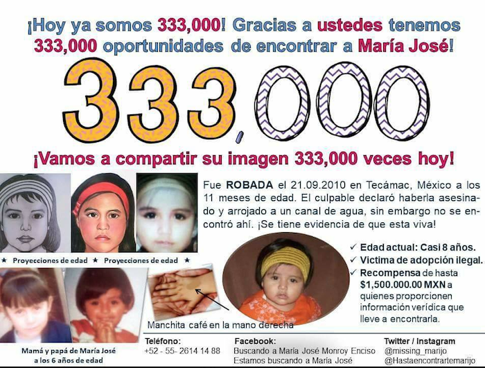 La amplia difusión de fotografías de personas no localizadas está relacionada con la capacidad de convocatoria de las páginas y la sensibilidad que despiertan los casos entre los usuarios. Entre los de mayor impacto se encuentra el caso de la bebé María José Monroy Enciso, de 11 meses de edad, que fue secuestrada con violencia en Tecámac, Estado de México, en 2010. La indignación que este caso ha despertado en las redes sociales ha alcanzado una dimensión global, pues los usuarios la buscan en Estados Unidos, Europa y todo México desde hace ocho años. Páginas creadas para su búsqueda –como @Pormajo– suman más de 422 mil seguidores al corte de esta nota.